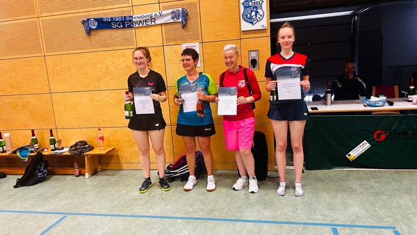 1. Patricia Wachs (TTC Wohlbach), 2. Pauline Stammberger (TTC HS Schwarza), 3. Talida Reumschüssel (TTC Thann) und Anna Schmidt (TSV 1860 Bad Rodach)